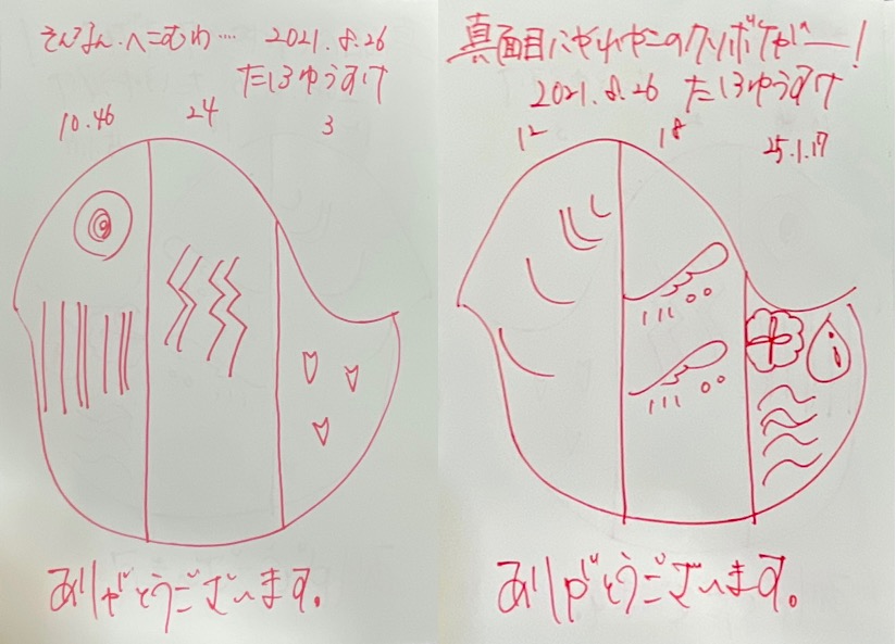 見比べてもらうとわかりますが、文字も絵も、感情の違いがもろに出てて面白いですね(^^)